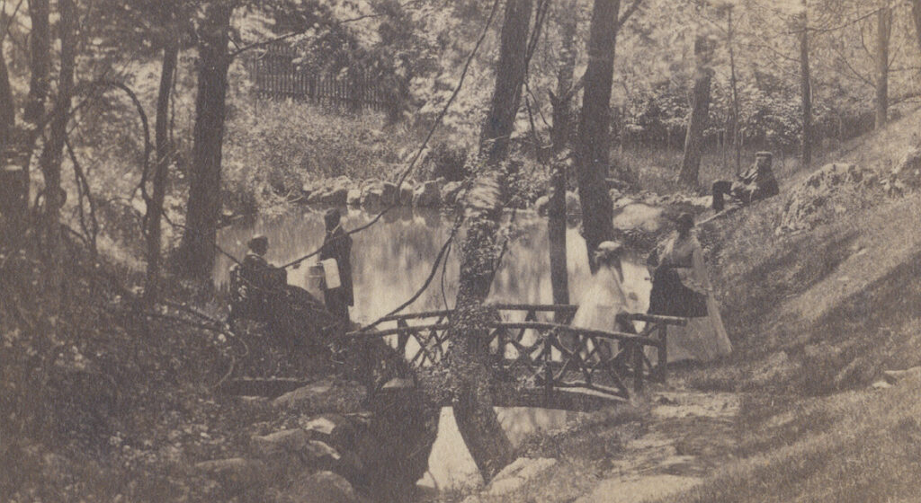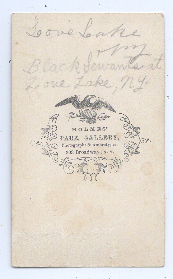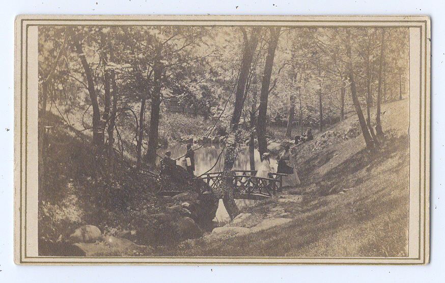 Heavenly cdv showing a family enjoy an outing in what we assume is somewhere in Central Park as this was captured by Silas Holmes Park Gallery at 303 Broadway, NY. If a New Yorker recognizes this site any information would be appreciated. There is a pencil inscription on the back that reads, “Love Lake, Black Servants at Love Lake, NY.” Sitting in a bench to the left of the bridge is a woman being served by an African American servant with the typical white linen napkin draped over his arm and holding a small basket. A young girl beautifully dressed in white hurries across the bridge to her young African American nanny who poses with a direct glance at Holmes. She is also dressed in an exquisite full gown. Enjoying some alone time the gentleman of the house leans into the ground in what appears to be a more casual outfit matching this setting. This serene scene is stunning with the still glassy lake in the background surrounded by woods with a little light streaming down in the center. The image is in excellent minus condition with nice tones and contrast. $55