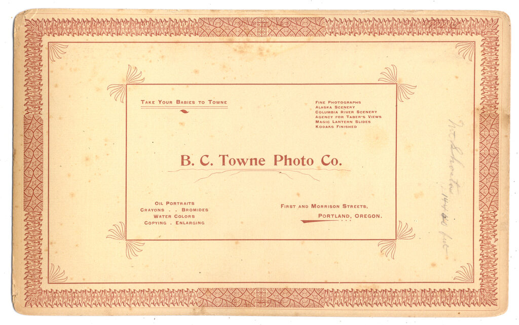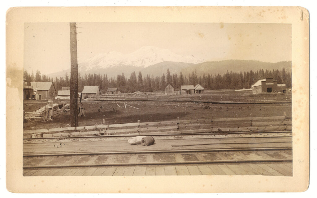Serene boudoir cabinet card showing Mt. Shasta in the background. This artistic photograph shows the railroad tracks in the foreground with two rolled travel packs lying on the platform. Were they from someone riding the rails or a paying customer? We will never know for sure but it definitely adds to that sense of excitement of the 19th century west. A small town is seen in the background with a livery stable along with horses and saddles on the far right which would be a necessity in this remote wilderness. A herd of cattle is visible in the fenced area on the left and we see chickens roaming on the right. The image is in very good condition with great tones and contrast. There are some spots as seen with most being on the mount. By B.C. Towne Photo Co., Portland, Oregon. We also love their ad on the back that reads, “Take your babies to Towne.” $50