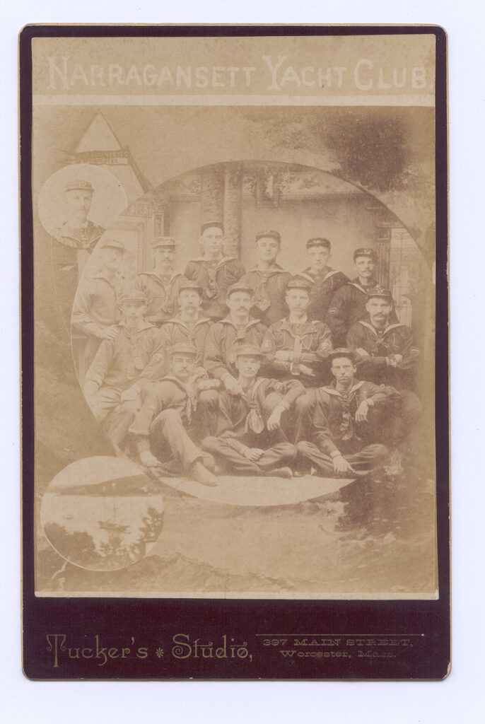 Dynamite montage cabinet card showing the Narragansett Yacht Club encased in a large circle. Their crew captain is presented in a smaller inset circle above on the left, while their large ship is seen in the water at the bottom. They certainly seem to be a tight-knit group and we love the creativity of Tucker’s Studio in Worcester, Mass. The image is in very good condition just a little lighter in tones as seen. The back has a gilded ad for Tucker that has been mistakenly double stamped.  $30