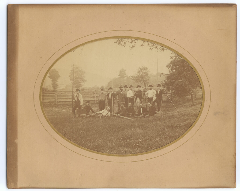 Fabulous mounted and matted albumen of a large group of surveyors out in the field. A few of these men look as rough and tumble as they come. The guy with the hat sitting in the front row looks as if he’d kill you in a heartbeat! Now the young kid on the left back row looks like he’s a newbie, with his cool hat and typical new work shirt. We assume the owner or manager of the group is the bearded man with the suit. We see two transits/ theodolites and numerous transit poles. Also the man on the far left might be holding a plane table. We’re not sure about the other piece of equipment on the ground on the right. The image measures 8” x 10” and a mat is mounted to the top. Judging from the toning on the perimeter we think this was probably framed at one time. It is in very good plus condition with nice tones and contrast. There is one darker spot on the man on the far left as seen.