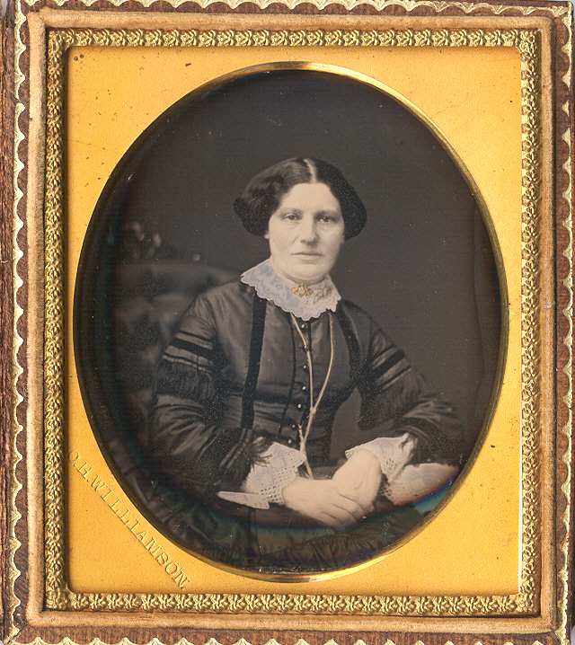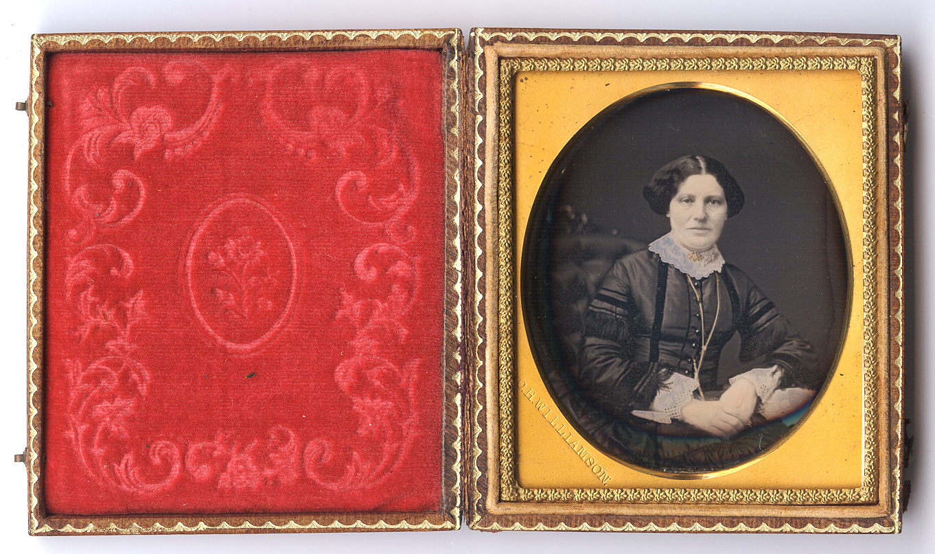 Treasured sixth-plate daguerreotype of a sophisticated woman identified by a brass mat stamp to C.H. Williamson. This was, of course, Charles Williamson who operated in Brooklyn, NY and was known for his expert hand tinting, especially the skilled application of flesh tones. She was certainly a woman of means and clearly known for her fashion sense as her outfit exhibits numerous techniques. We see an expertly tailored dress with perfectly placed dark piping and cutting edge fringe mid-arm, above white lace cuffs. A gold-gilded broach is seen on her beautiful lace collar and a long, gilded chain around her neck for her watch or pen. The plate is in excellent minus condition with sharp tones and contrast with expertly tinted flesh tones on her face and hands. The image had old seals attached and we have resealed it with a new glass. It is housed in a full case. Please see the following lot for what might be her daughter.