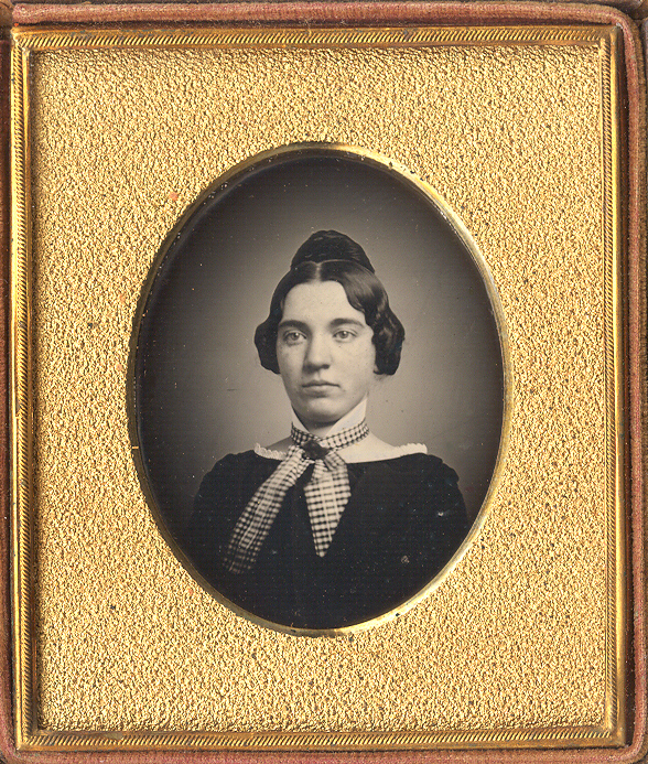 Brilliant sixth-plate daguerreotype of a young woman that was purchased with the previous lot who is mostly likely her mother. Presented with a smaller mat opening, this sharp image really shines. She is dressed in a simple black dress with a cool plaid bow and what we feel is a probably a daguerreian broach at her neck.  Her hair is expertly wrapped hair around what appears to be a hair comb and we would not be surprised if her hair reached to her mid-back. The plate is in excellent minus condition with a couple some small spots. We have resealed it with a new glass and it resides in a simple floral case indicative of the late 1840’s. This lot also includes a ninth-plate ambrotype that was included and appears to be her or a sister at a later date.