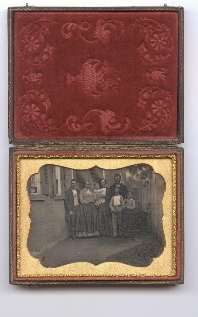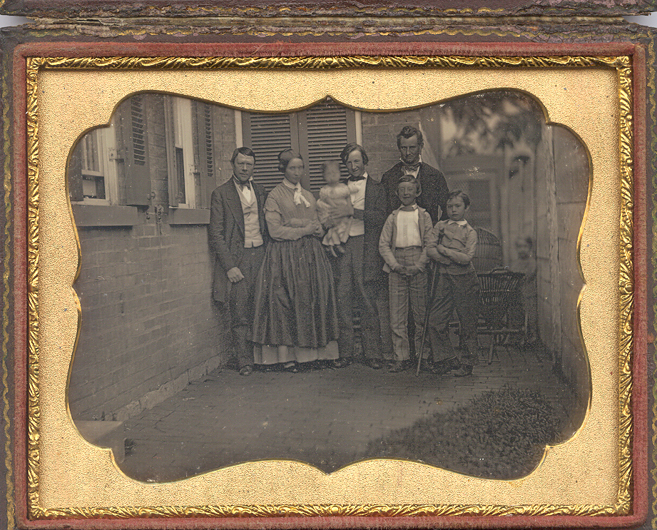 Rare quarter-plate daguerreotype of the Mullen family outside their Cincinnati home. Please also see the next three lots, which contain more images of the family. In this image, Jonathan Mullen stands on the left with his wife Frances “Franny”, (Kimball), Mullen. According to census data Jonathan was a furniture and fixtures maker. They had seven children, James A. born, 1834, Joseph K. 1836, Jonathan Jr, 1838, George, 1841, Emma, 1845, William H., 1848, Frances S., 1851. We aren’t sure of the exact identities of the children as the man on the right certainly looks older than their eldest son would be at the date of this daguerreotype. Records show that Jonathan had just one sibling, a sister, and it appears Frances’ was an only child so the older gent wouldn’t be a sibling. There are later portraits of William Henry and Emma but with six people besides the parents present it makes identification uncertain. Emma died in 1849, so it is possible she isn’t even in this daguerreotype. The boy on the right of the group is leaning on a crutch, so he has either hurt himself before the family portrait or has a disability. One of the little ones decided to leave the family and lean on the baby carriage on the far right. The image is in very good plus condition with nice tones and contrast. We have resealed the plate with a new glass and it is housed in a full case. It is certainly uncommon to find an identified family portrait captured outside their home in the US.