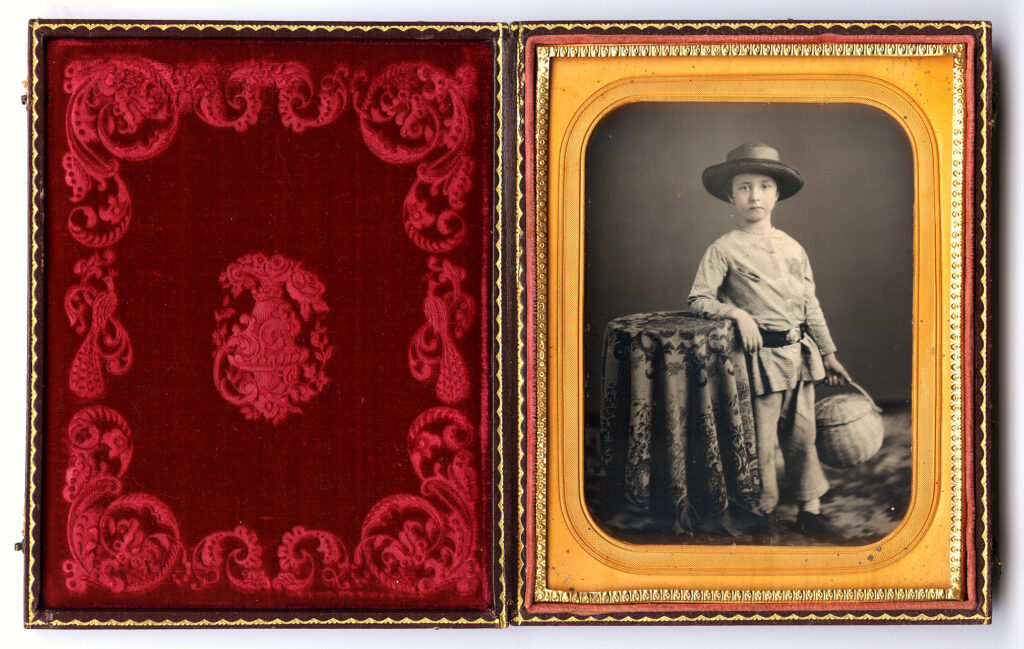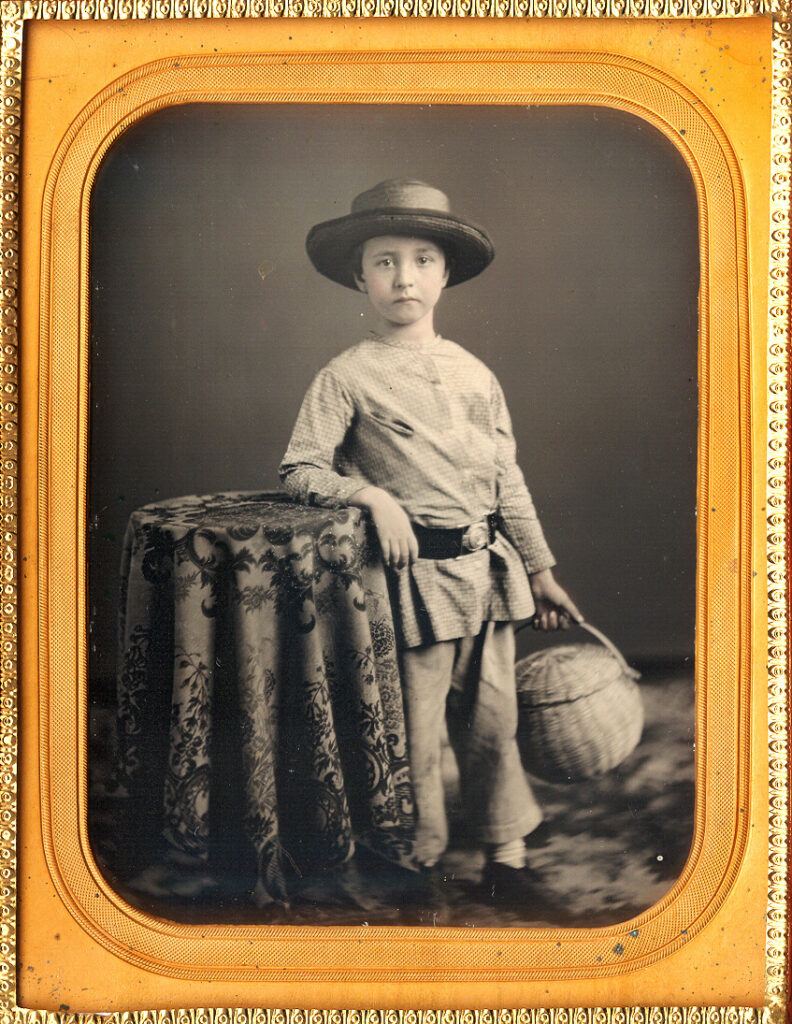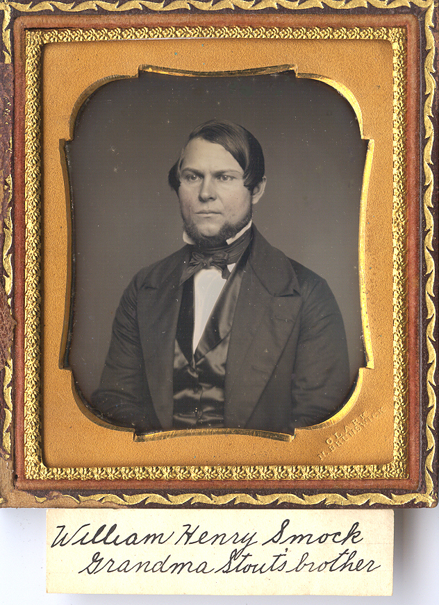 Great sixth-plate daguerreotype identified with a period handwritten note as “William Henry Smock, Grandma Stouts brother.” This image is also brass mat marked for Clark, New Brunswick. According to Craig’s Registry this would have been David Clark, listed as “a Daguerreian in New Brunswick, N.J., 1853-1855. He exhibited at the New York Crystal Palace in 1853. In 1855 he was listed at the “City Daguerreian Gallery”, 11 Peace Street. He advertised he had “long been known…” An interesting additional feature is that the image has C.40 in a diamond hallmark and Rinhart’s list this plate mark as unknown. Is it possible that Clark produced his own plates? William Henry Smock’s genealogy is readily available. He was born in New Jersey in1818 and died there in 1899. His family lived in Piscataway, NJ and in the 1870 census he was listed as a farmer. He married Mary Ann Stout, and his sister, Cornelia, joined the same family when she married Mary Ann’s brother, Zephaniah Stout. William is an intense gentleman. His farm must have been prosperous as he is dressed in a nice suit with a silk vest. We love the large sweep of hair to the one side! The daguerreotype is in excellent minus condition with strong tones and contrast and some light tint to his face. The plate had old seals and we have resealed it with a new glass. It is housed in full case with matching halves with a repaired hinge. It fits perfectly but the back has a gold gilded border on the outside and the inside gilded borders are a mismatched.