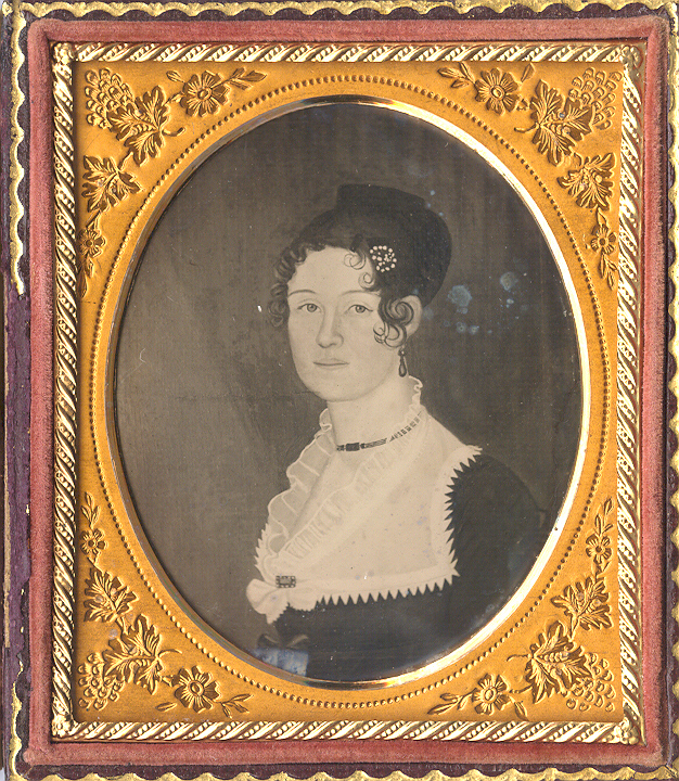 Gorgeous sixth-plate painting daguerreotype of a beautiful young woman dressed in a black dress with a unique white cut lace collar. Her exquisite hair is styled with intricate spit curls and adorned with a jeweled hair pin. The plate has an identification attached on the front of the case that reads, “This may be Jane Elizabeth Russell who married Joel Root. She was the daughter of an English Captain in the Army.” This American daguerreotype is in very good plus condition with great tones and contrast. We have resealed it with a new glass. In a delightful twist the full case has a repair to the hinge where a previous person used an old parcel post label that partially reads, Postmaster, Contents- Merchandise Fourth Class. This parcel may be opened for postal…”