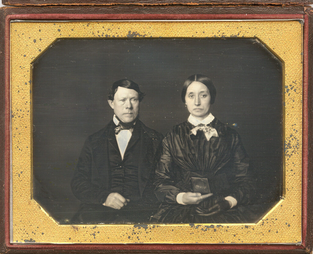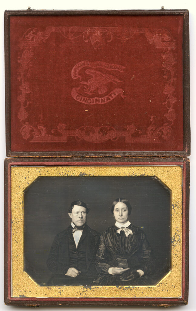 Heart-breaking half-plate mourning daguerreotype of Jonathan and Frances Mullen holding a sixth-plate post-mortem daguerreotype of their daughter Emma, who died in 1849 from the croup. The note reads that it was “captured fall of 1849.” Frances appears to be wearing a photo pin at her neckline and it could possibly be of Emma too, but it is difficult to see. Wearing respectful black outfits you can see the shear devastation on their faces. Frances appears numb while Jonathan fights back the tears. Jonathan would die seven years later in 1856. In 1860 the rest of the children appear to still be living at home helping their mother. The plate is identified with a velvet mat mark for Hawkins Apollo Rooms. According to Craig’s Registry, “Ezekial C Hawkins reportedly opened his first daguerreian rooms in 1840 in Cincinnati, Ohio; he claimed later that his was the first gallery in the city, and the second in the United States. Another source indicated that Hawkins opened his rooms on August 27, 1841, opposite the Post Office, and in partnership as Hawkins and Todd. In October, 1841, he moved his gallery to the corner of Main and Fourth Streets, over Mr. Luckey’s store.” From 1848 to 1852, Hawkins was listed in Cincinnati as a daguerreian in the Apollo building, northwest corner of Fifth and Walnut Streets. He was apparently in business at his “Apollo Rooms” with John P. Hawkins, variously identified as his brother or his nephew. The daguerreotype is in very good plus condition with strong tones and contrast. There is an extremely light tint to their lips and we see some light buffing lines at an angle. There are also a couple tiny mat marks as seen. We have resealed the plate with a new glass and it is housed in a lovely full case with the cover being the exact design as the one with Emma’s half-plate daguerreotype.