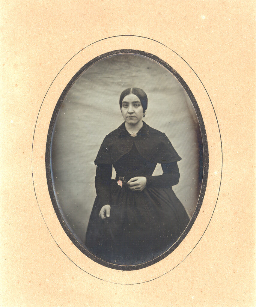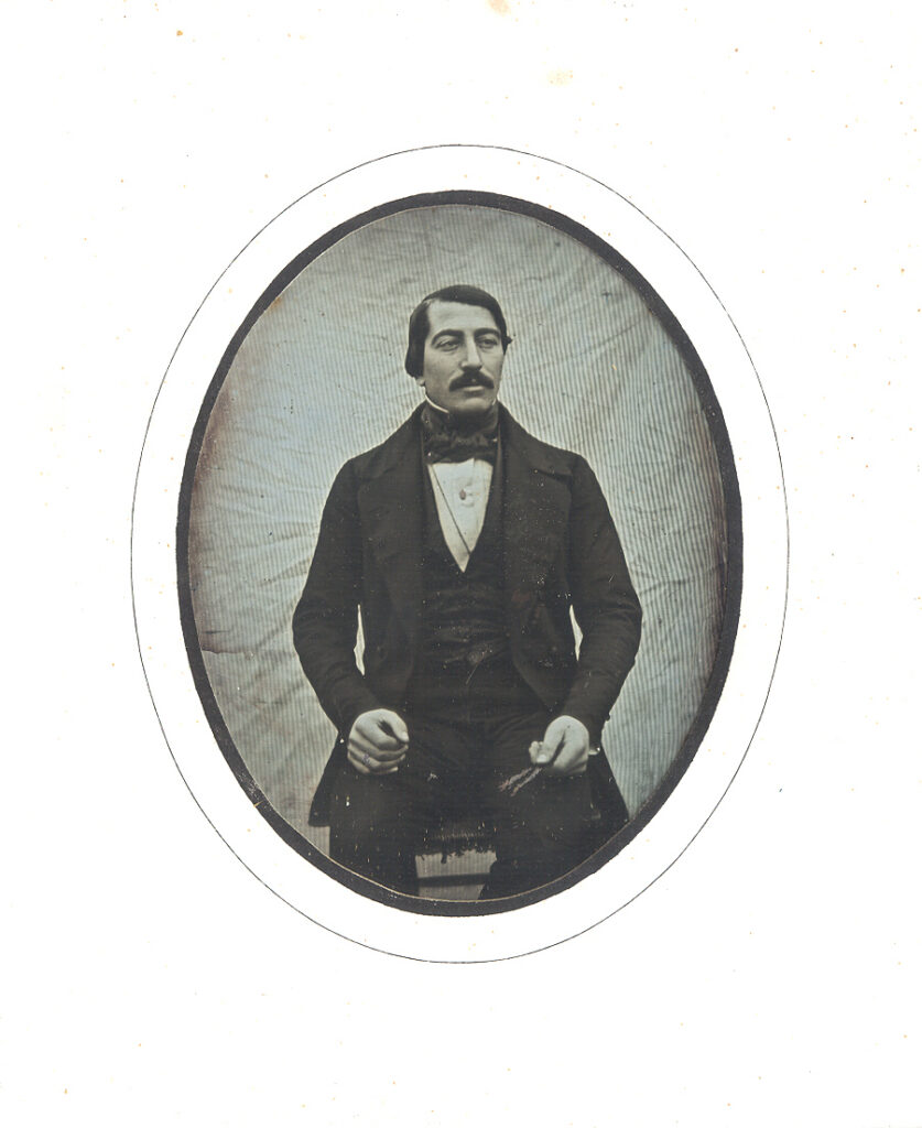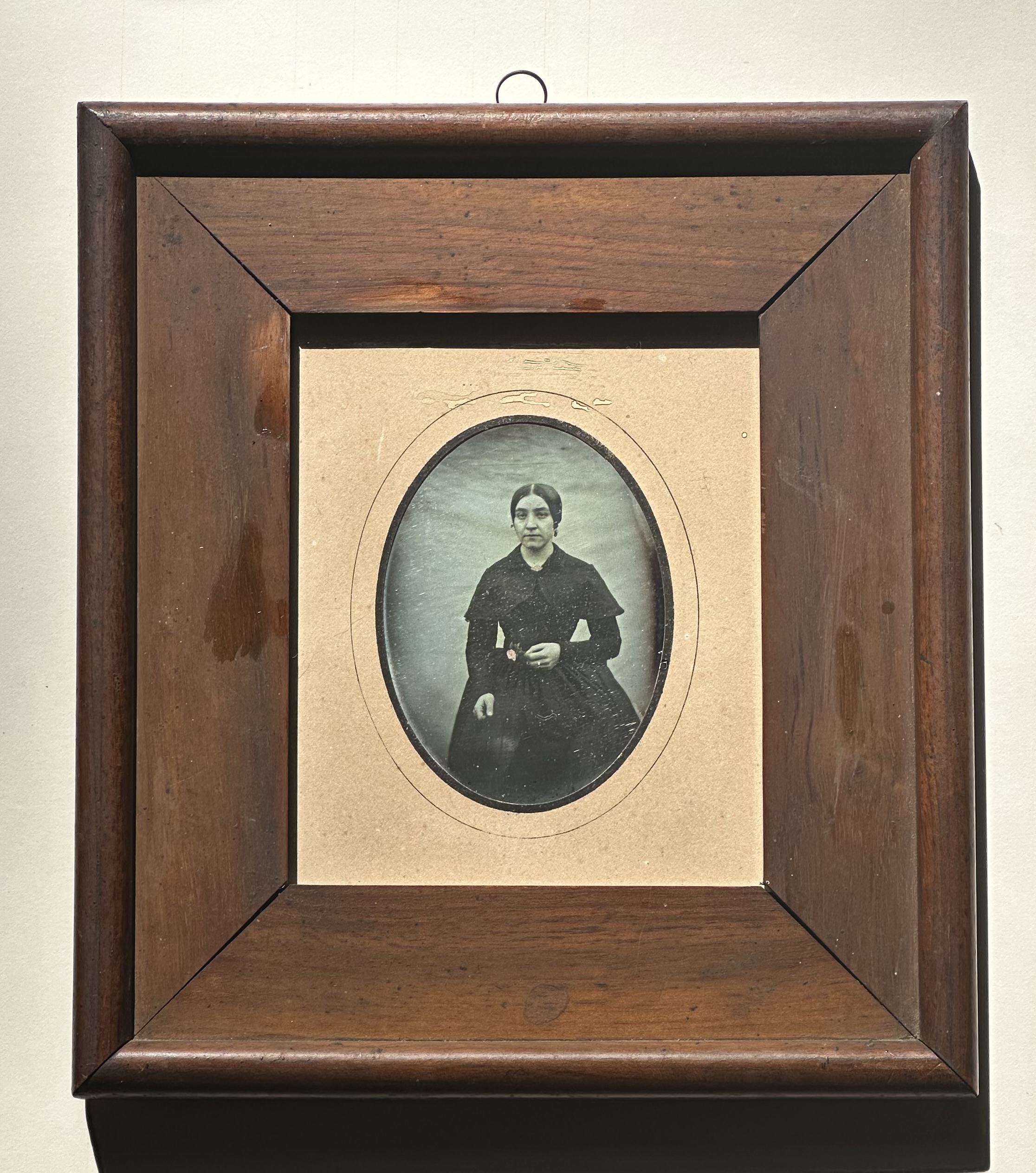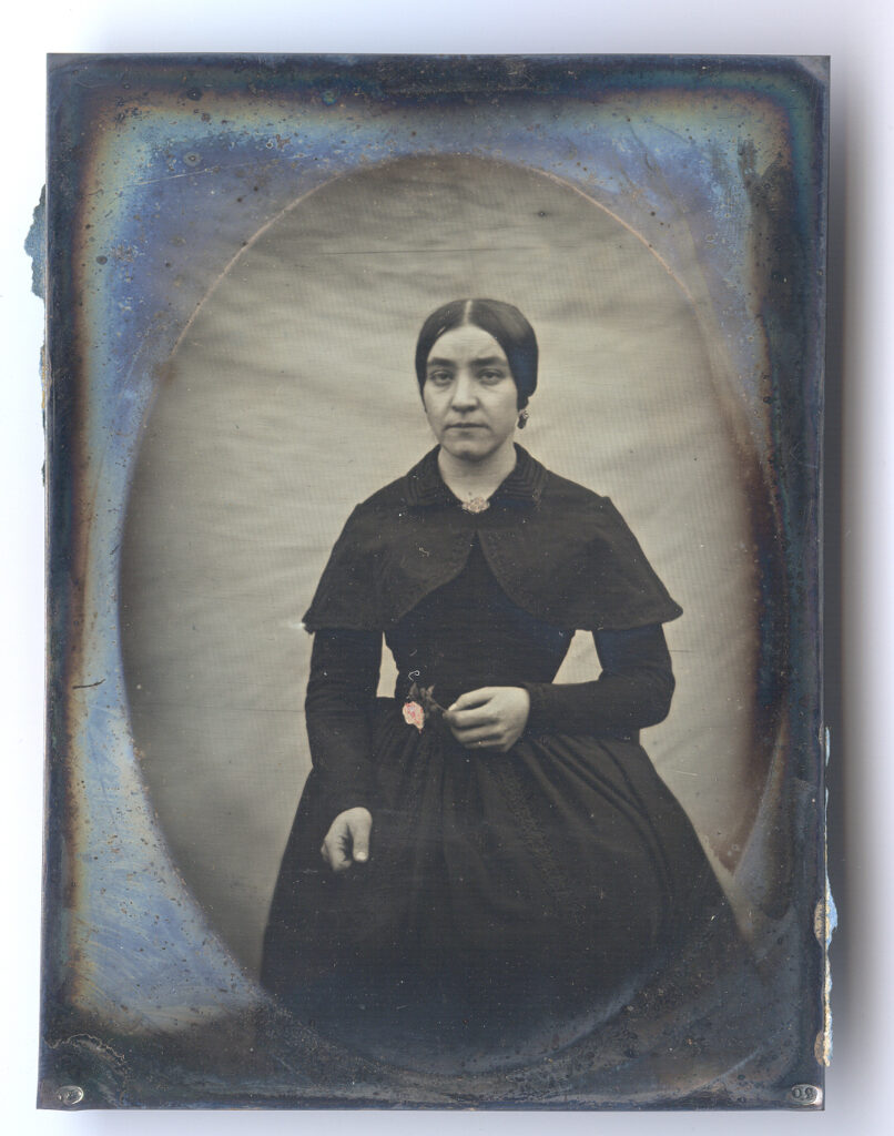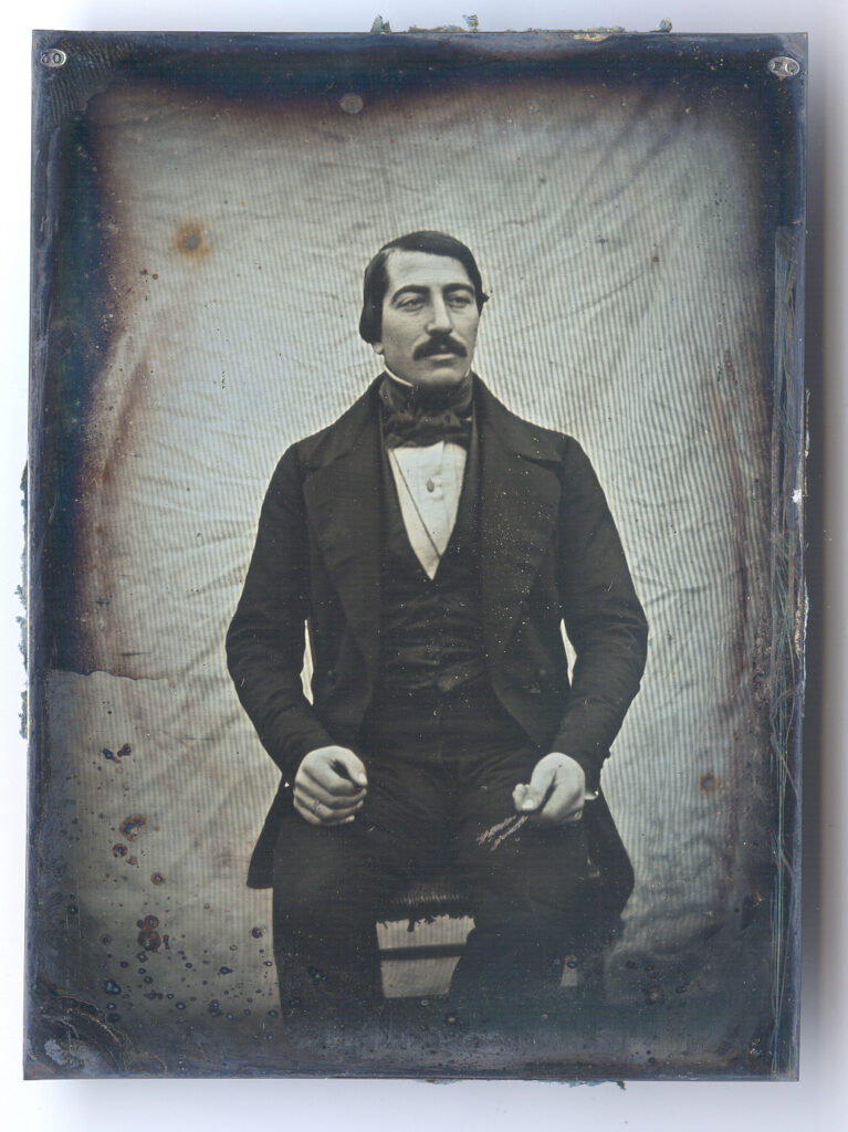 Exceptional pair of 1840’s European quarter-plate daguerreotypes of a wife and an occupational of her husband in their original frames. We can’t quite decipher part of the woman’s hallmark, but the stamp on the husband’s image is 30 on one side and FC on the other. According to Gabriele Chiesa & Paolo Gosio’s research on hallmarks, this was found on an Italian daguerreotype. Regardless of their origin, the simplicity of these portraits is divine. The thinly striped background behind the gentleman’s portrait is effortless yet perfectly complements the strong tones the daguerreotypist achieved. He holds a crudely tinted caliber suggesting a number of possibilities as a profession. His wife is posed in front of the same backdrop, yet there seems to be some movement as the fabric is slightly distorted without the linear features. The tonal quality is also a little more subdued yet provides a lovely contrast. She holds a single crudely tinted red rose. Both are dressed in elegant formal outfits that fit that European 1840’s time period. Both daguerreotypes are in excellent condition with some light buffing lines seen at an angle as is the case with these earlier plates. These had the original seals still attached and we opened them to replace the old worn glass. The woman’s paper mat has some toning while her husband has some pinprick spots. They are presented in matching wood frames with the hanger still attached and ready for your wall.