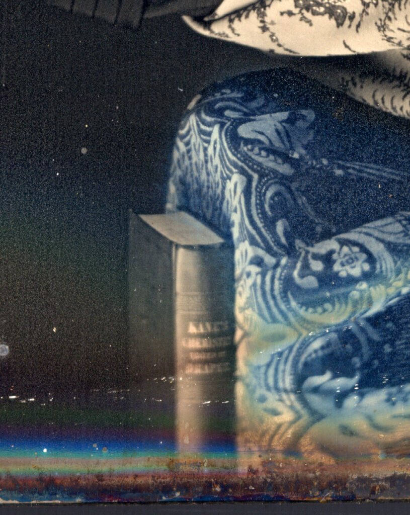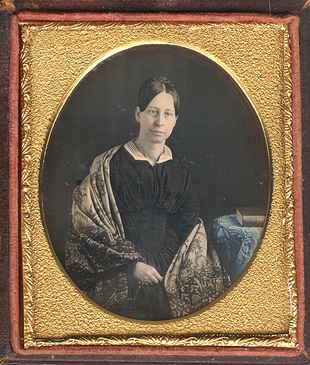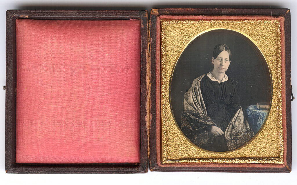 Vibrant sixth-plate daguerreotype of an intellectual woman wrapped in a gorgeous large, patterned shawl and with a special book, Kane’s Chemistry, edited by Harper, on the table next to her. The title is the American version with additions and corrections written by John William Draper, M.D., who is well-known in the daguerreian world. Possibly this is the daguerreian’s book, but it is equally possible this woman was a scientist herself. She wears a black dress and while quite classic it has a mesmerizing white collar which creates a wonderful illusion. It is hard to tell if this is a geometric cut-out or if it is black fabric alternating with the white. The photographer has skillfully tinted the tablecloth a lovely blue. The plate is in excellent minus with great tones and contrast and some light hues to her face and lips. It had old seals intact and we have now resealed it with a new glass. It is housed in a full late 1840’s leather case with a floral design.