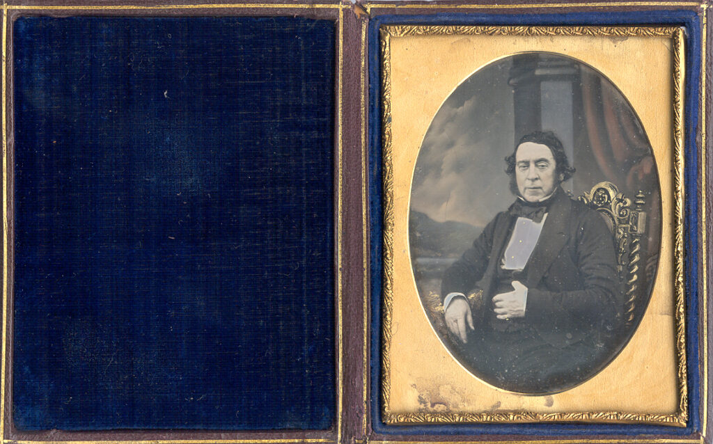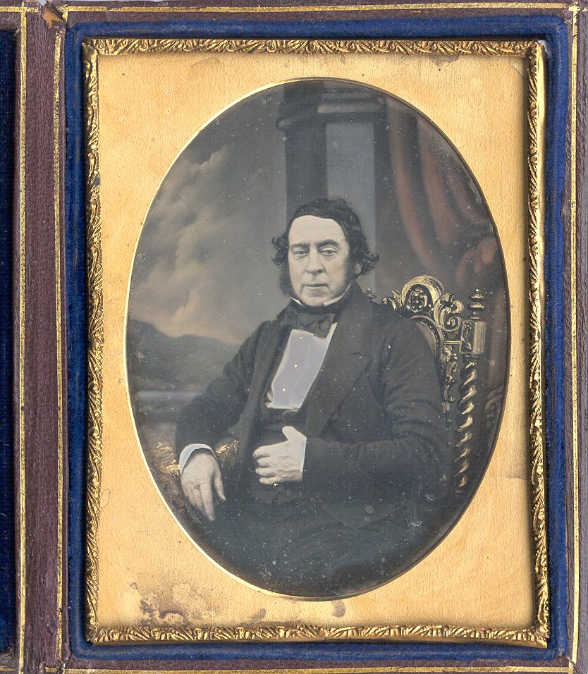 Heavenly hand tinted English quarter-plate daguerreotype of a distinguished gentleman. This is not identified but the chair is commonly seen in daguerreotypes by Oliver Sarony. Sarony was born in Quebec and was trained as a daguerreotypist in NY before travelling to England. He set-up his studio in Scarborough which eventually, because of all the business he brought to town the square where his studio was located, was renamed “Sarony Square.” Information is courtesy of the National Portrait Gallery, London. This dramatic plate is quite lavish, with Sarony’s gold gilded chair and a red drape next to an enormous column. To the left we see a tinted stormy sky ominously hanging off the cliffs along a blue tinted lake. The older man sits quite stoically staring intently at the photographer. The plate has vibrant tones and contrast and the hand tinting is as professional as you will find. There are a few small light scratches that are harmless in our opinion. We have resealed it with a new glass and it is housed in a lovely book style case with clasp.