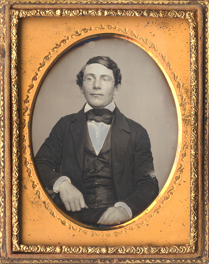 Fun quarter-plate daguerreotype of a happy young man with a slight grin. The bespeckled, studious-looking lad appears to be slightly uncomfortable in this setting. Despite that, he is perfectly styled with a nice suit and tie. The plate is in very good plus condition with a lovely milky background and strong tones. There is a spot on his elbow on the right side as seen and a hint of a tiny ding by the mat on the upper right side. It was previously resealed, and someone has penciled Maine on the new seals. It is housed in half of a case.